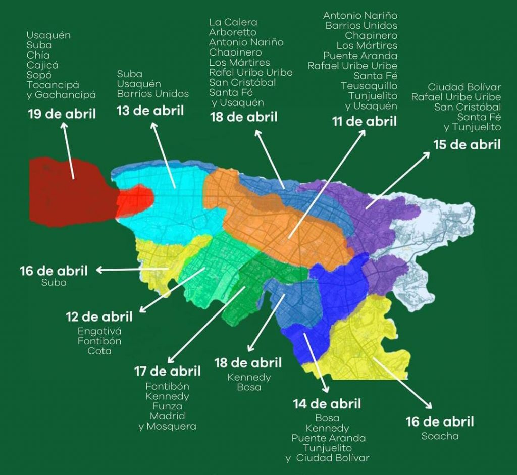 Para mitigar el desabastecimiento de sus embalses, la ciudad de Bogotá y 11  municipios aledaños tendrán restricciones al suministro de agua, como se muestra a continuación.