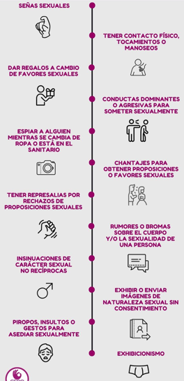 Se refiere a cualquier tipo de conducta o comentario de naturaleza sexual que ocurra en el entorno de trabajo y que resulte indeseado, humillante o intimidante para la persona que lo recibe. Esto puede incluir gestos, comentarios, contacto físico no deseado, avances sexuales o cualquier otra forma de comportamiento que cree un ambiente de trabajo hostil o intimidatorio.